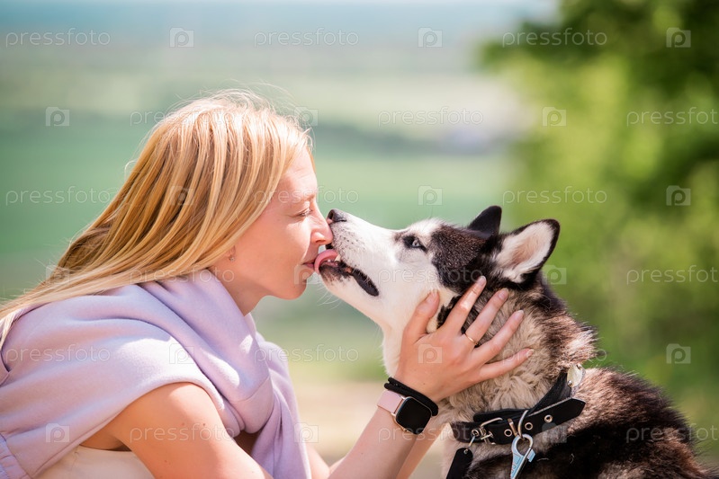 Сибирский хаски лижет лицо своей хозяйке, которая обнимает его на фоне лесной дороги в солнечный день