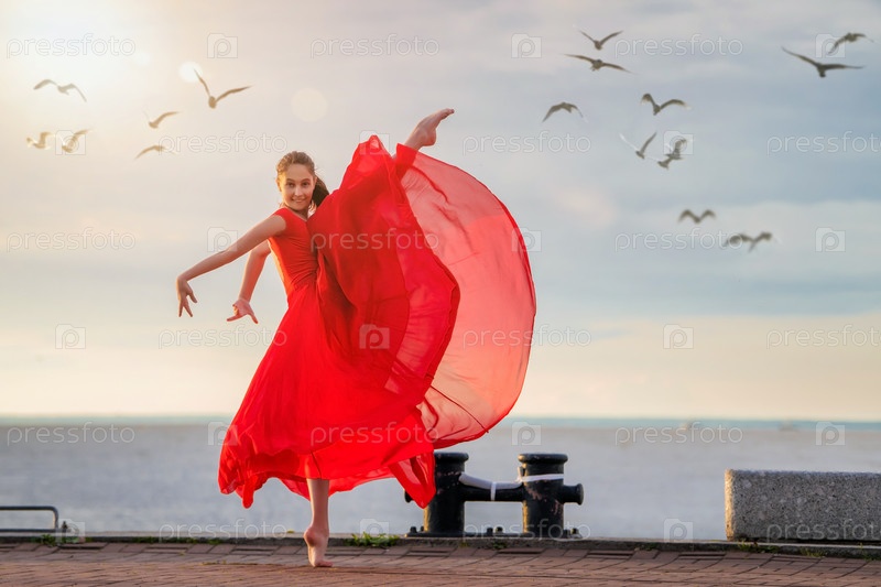 Танцующая балерина в красной летящей юбке и трико на набережной океана или на морском пляже в окружении чаек в небе