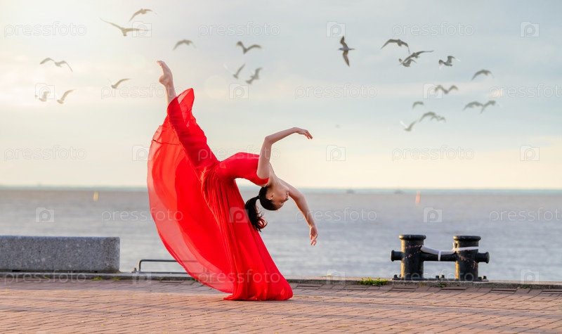 Танцующая балерина в красной летящей юбке и трико на набережной океана или на морском пляже в окружении чаек в небе