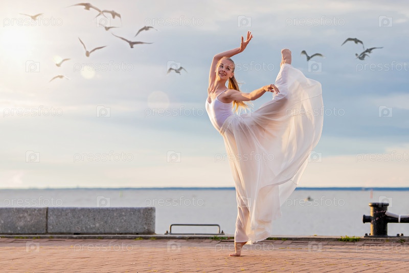 Танцующая балерина в белой летящей юбке и колготках на набережной океана или на морском пляже в окружении чаек в небе