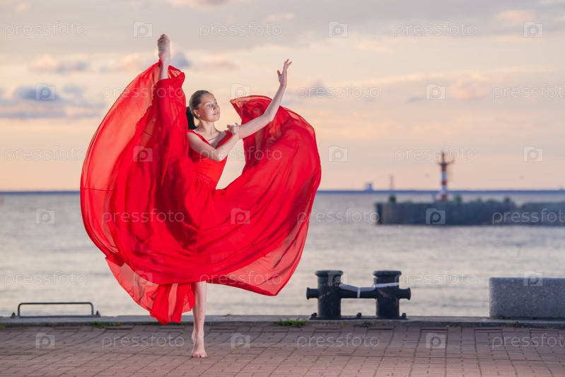 Танцующая балерина в красной летящей юбке и колготках на набережной океана или на морском пляже на фоне закатного неба