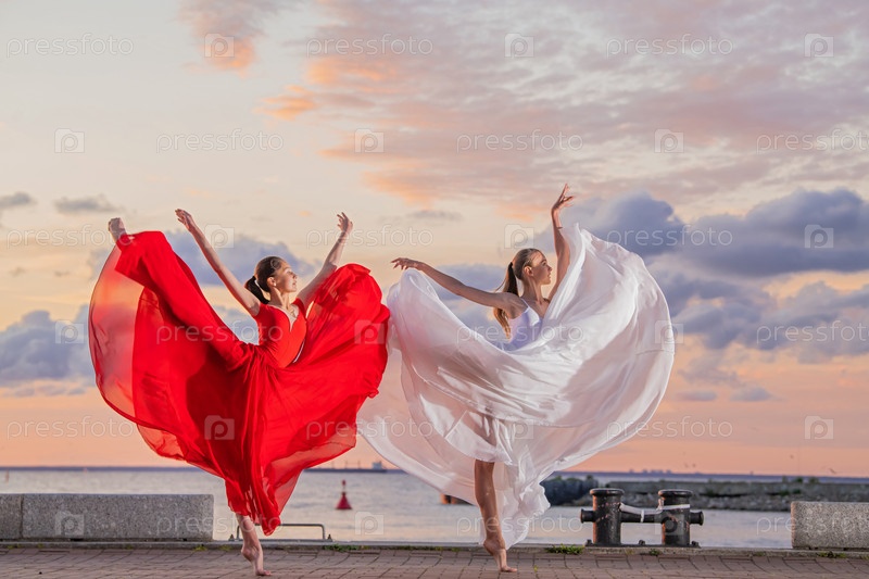 Две балерины в бело-красной летящей юбке и трико танцуют дуэтом на набережной моря на фоне закатного неба