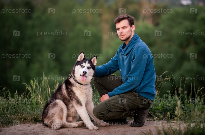 Портрет красивого молодого человека и его любимой собаки сибирской хаски на природе вечером на закате