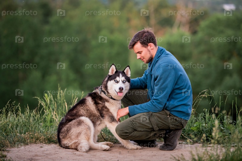 Портрет красивого молодого человека и его любимой собаки сибирской хаски на природе вечером на закате