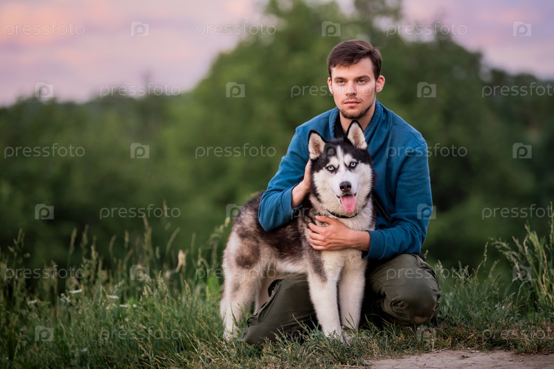 Портрет красивого молодого человека и его любимой собаки сибирской хаски на природе вечером на закате