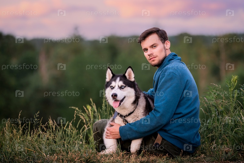 Портрет красивого молодого человека и его любимой собаки сибирской хаски на природе
