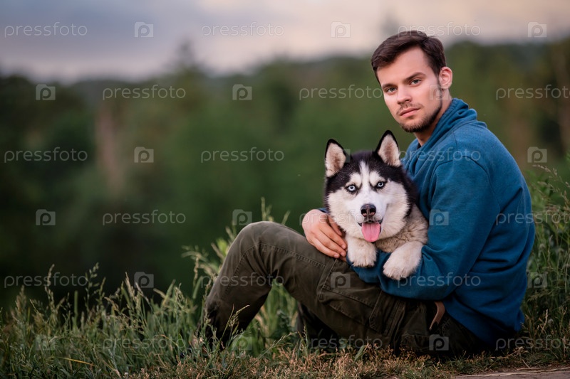 Портрет красивого молодого человека и его любимой собаки сибирской хаски на природе