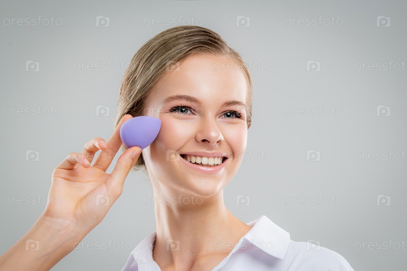 Милая красивая натуральная брюнетка очищает лицо хлопковой губкой, улыбаясь, глядя в камеру на белом фоне. Косметология и спа