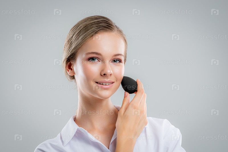 Милая красивая натуральная брюнетка очищает лицо хлопковой губкой, улыбаясь, глядя в камеру на белом фоне. Косметология и спа