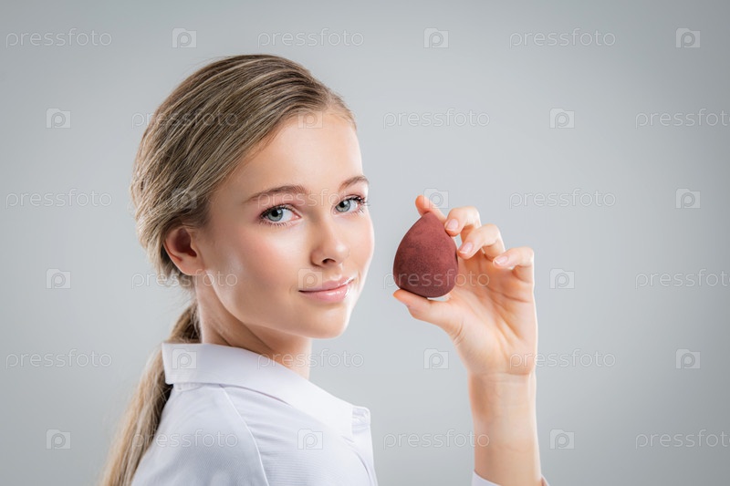 Милая красивая натуральная брюнетка очищает лицо хлопковой губкой, улыбаясь, глядя в камеру на белом фоне. Косметология и спа