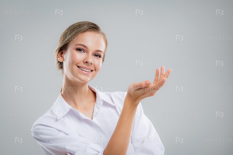 Женщина курорта красоты с совершенной кожей Портрет. Красивая брюнетка спа-девушка показывает пустое пространство для копирования на открытой ладони для текста. Предложение продукта. Жесты для рекламы