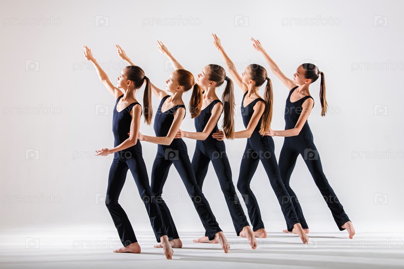 Группа детей, маленьких девочек в одежде спортивного стиля, танцующих в классе хореографии, изолированных на заднем плане