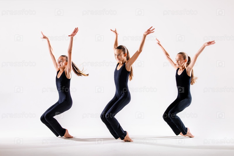 Группа детей, маленьких девочек в одежде спортивного стиля, танцующих в классе хореографии, изолированных на заднем плане
