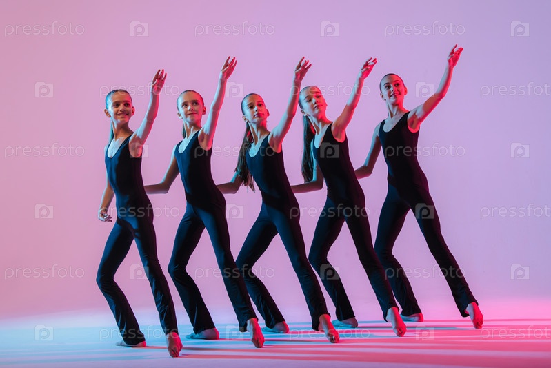 Группа из пяти подростков-балринов в черных обтягивающих костюмах танцует современный контепорари на сиреневом фоне