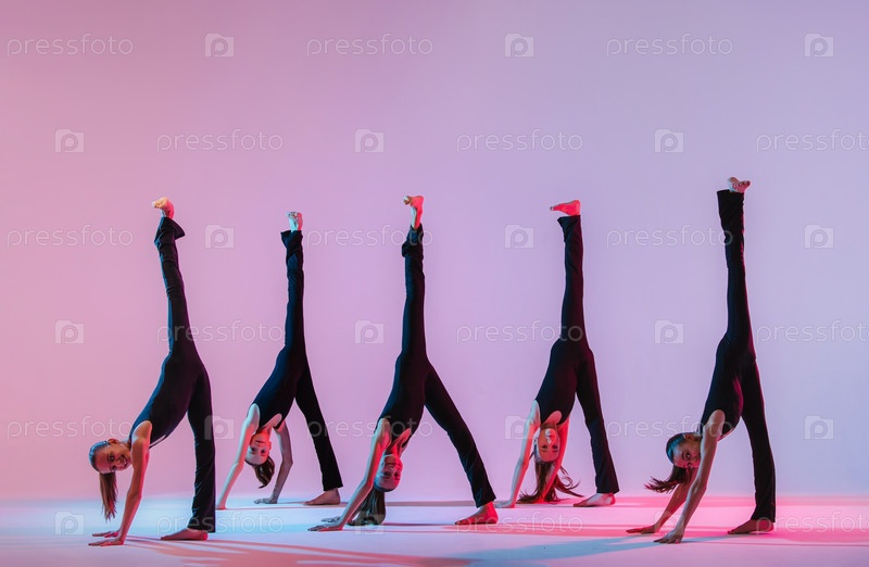 Группа из пяти подростков-балринов в черных обтягивающих костюмах танцует современный контепорари на сиреневом фоне