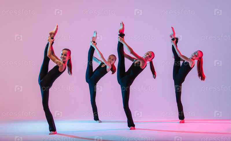 Группа из пяти подростков-балринов в черных обтягивающих костюмах танцует современный контепорари на сиреневом фоне