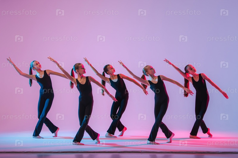 Группа из пяти подростков-балринов в черных обтягивающих костюмах танцует современный контепорари на сиреневом фоне