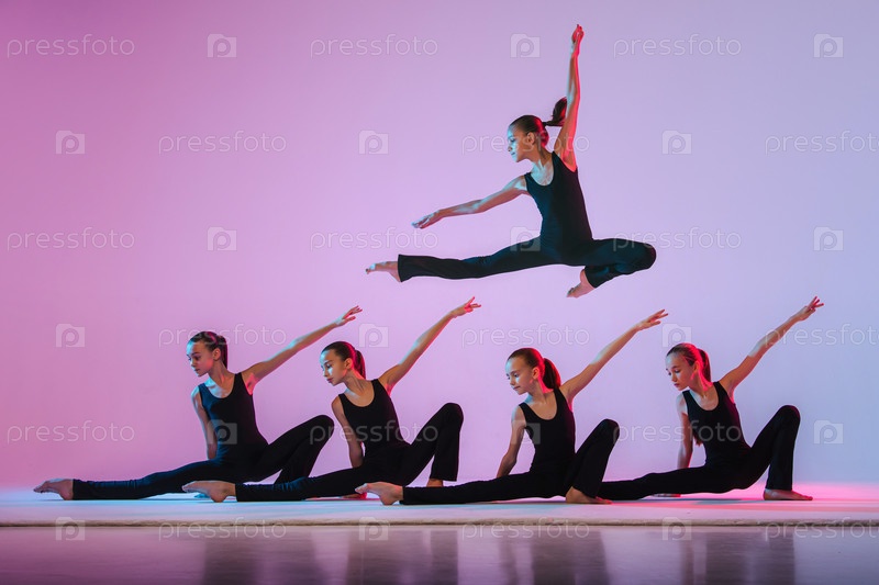 Группа детей, маленьких девочек в одежде спортивного стиля, танцующих в классе хореографии, изолированных на заднем плане в неоновом свете