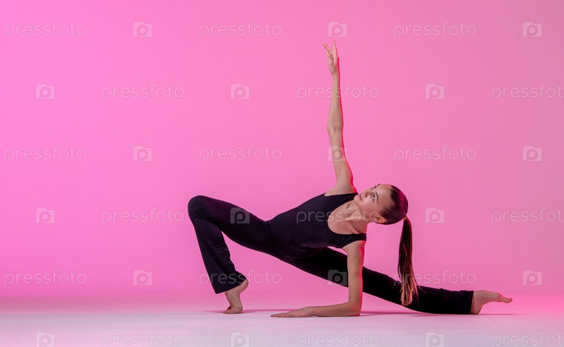 Девочка-подросток в обтягивающем черном костюме танцует современного современного танцора, изолированного на фоне в неоновом свете