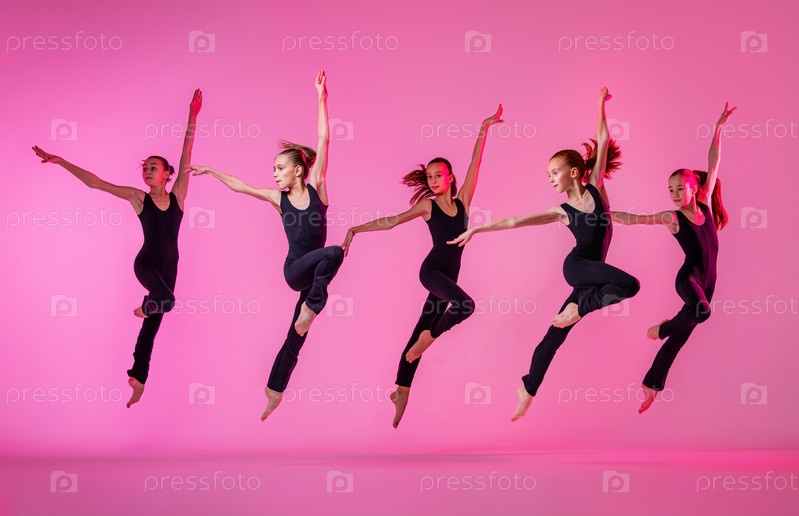 Дети танцуют. Группа детей, маленьких девочек в одежде спортивного стиля, танцующих в студии, изолированных на заднем плане в неоновом свете