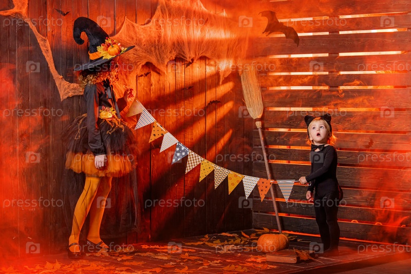 Счастливого Хэллоуина. Две милые веселые ведьмы с флагами и паутиной, развешивающие праздничные украшения