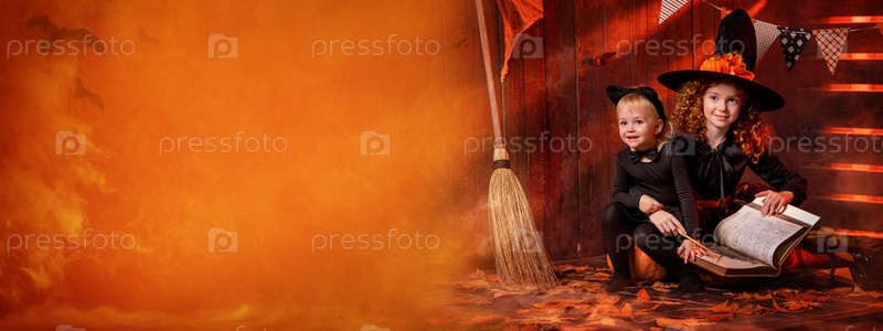 Счастливого Хэллоуина. Две милые веселые ведьмы с волшебной палочкой и книгой заклинаний колдуют
