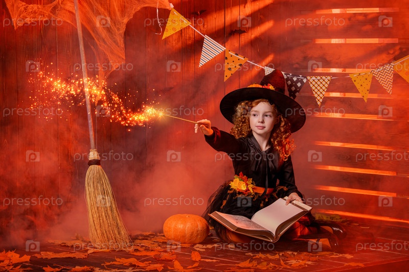 Счастливого Хэллоуина. Милая веселая маленькая ведьма с волшебной палочкой и книгой заклинаний колдует