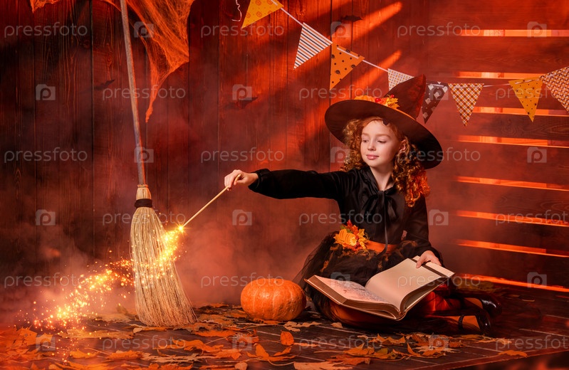 Счастливого Хэллоуина. Милая веселая маленькая ведьма с волшебной палочкой и книгой заклинаний колдует