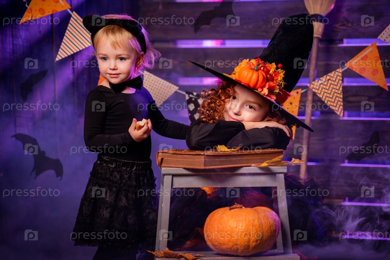 Счастливого Хэллоуина. Две милые веселые ведьмы с волшебной палочкой и книгой заклинаний колдуют