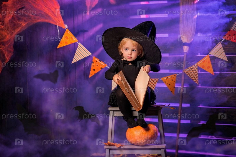 Счастливого Хэллоуина. Милая веселая маленькая ведьма с волшебной палочкой и книгой заклинаний колдует