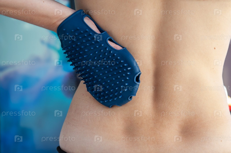 Антицеллюлитный силиконовый или резиновый массажер - варежка для тела в женской руке на фоне тела