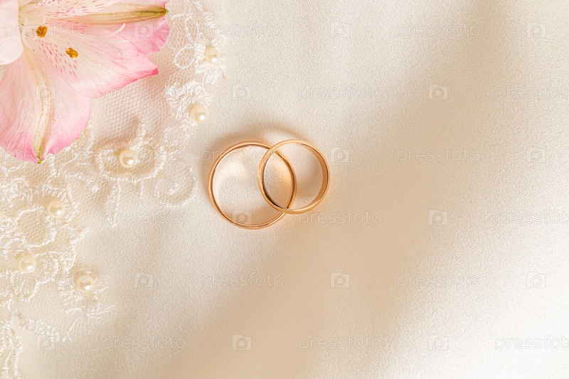 Вид сверху на два золотых обручальных кольца на фоне атласной ткани с вышивкой тюлем и розовым цветком. Свадебный фон. место для текста