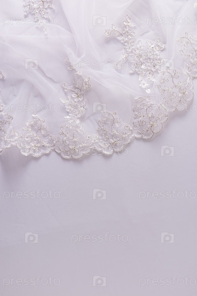 Часть кружевной вышитой тюлевой ткани на белом атласном фоне. Вертикальный вид. Пространство для копирования. Макет для свадебного дизайна