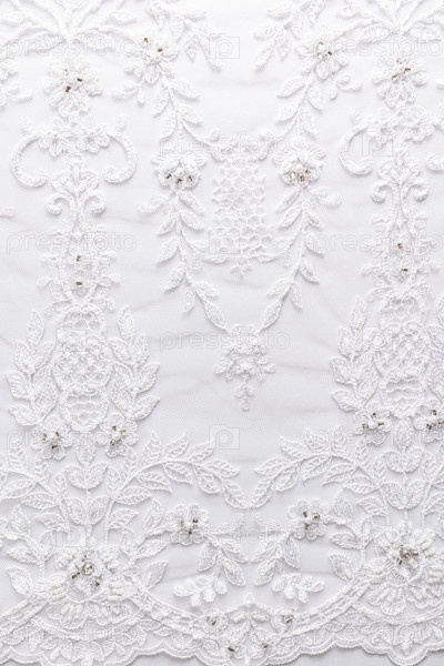 Вертикальный белый фон свадебного кружева с бисером и жемчугом на белой атласной ткани.. Свадебный макет для дизайна