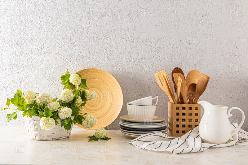 Различная кухонная утварь из экологически чистых материалов на светлой каменной столешнице с плетеной корзиной с цветами. современная кухня
