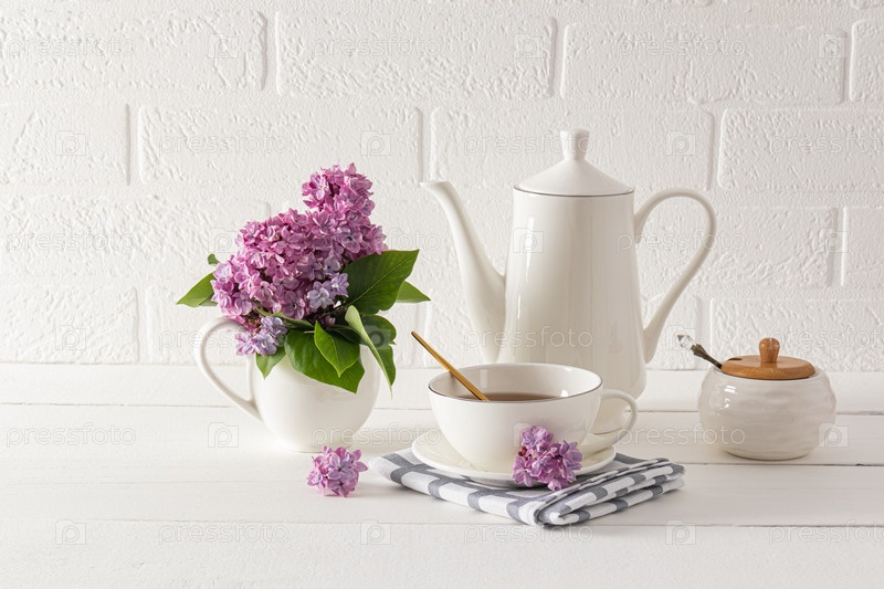 Чайная церемония ранним утром. Натюрморт с чашкой чая, сахарницей, кофейником на белом деревянном столе напротив стены из белого кирпича