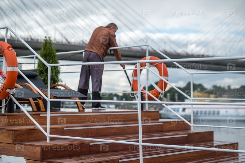 Россия, Санкт-Петербург, 10 сентября 2022 г.: Мужчина моет палубу яхты шлангом