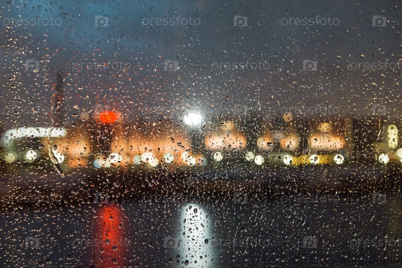 Вид сквозь мокрое стекло на ночные огни набережной