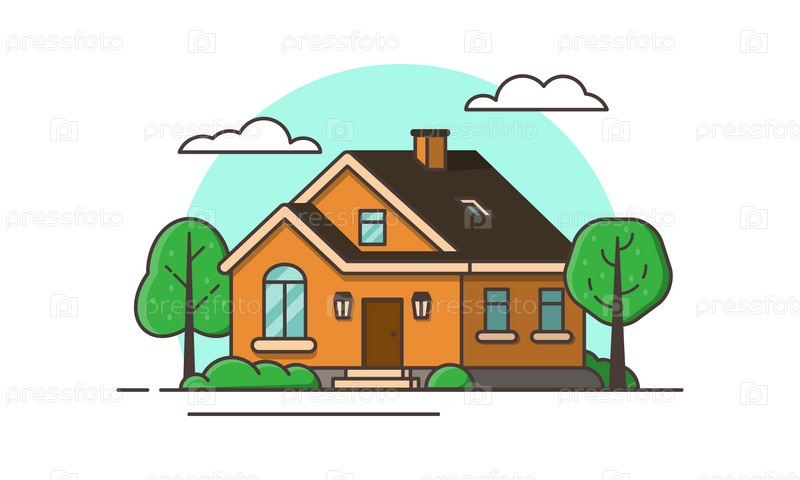 Дом представляет собой коттедж с кустами и деревьями на фоне неба. Концепция жилой недвижимости в аренду, продажа, кредит. Цветная векторная иллюстрация стиля плоского контура
