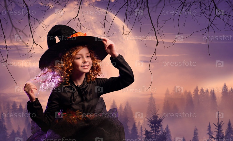 Хэллоуинская ведьма. красивая маленькая девочка в шляпе ведьмы на фоне огромной сиреневой луны. Широкий художественный дизайн Хэллоуина
