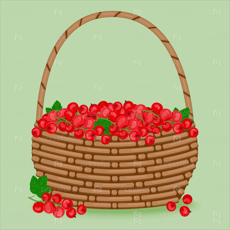 Ягоды красной смородины с зелеными листьями в плетеной корзине. Концепция здорового питания. Спелые ягоды. Сбор фруктов. Векторная иллюстрация в плоском стиле