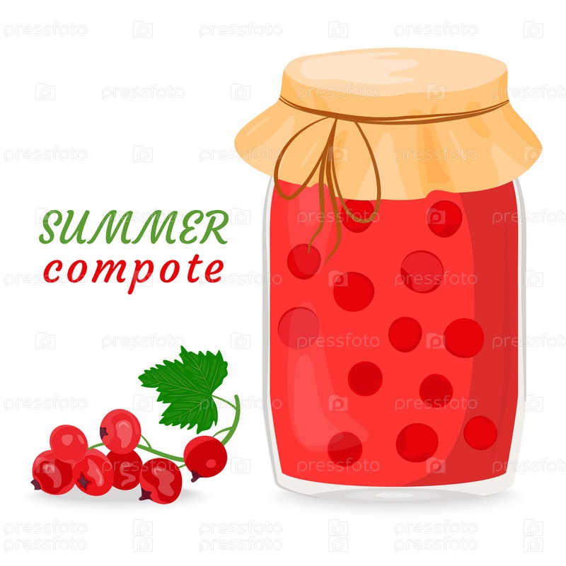 Компот из красной смородины, варенье или желе в стеклянной банке. Консервированные фрукты. Ягоды для здорового летнего напитка. Сохранение для будущего использования. Векторная иллюстрация для меню, дизайн упаковки в плоском стиле