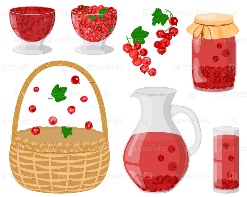 Набор красной смородины. Летний компот в графине, стакане, банке. Питье и варенье из домашних фруктов. Ягоды для здорового напитка. Концепция здорового питания. Плетеная корзина. Векторная иллюстрация
