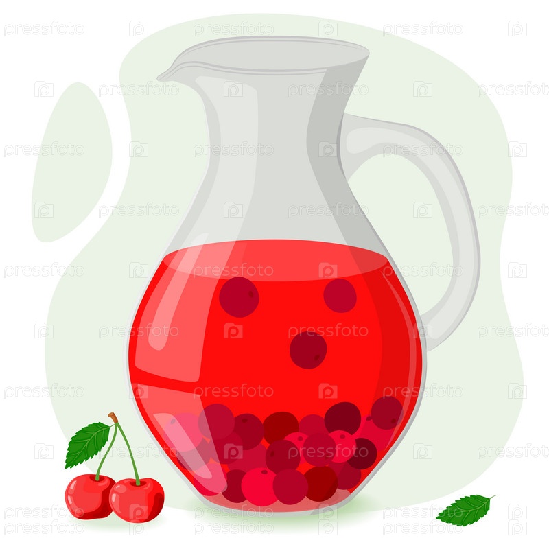 Вишневый компот в стеклянном графине. Питье из домашних фруктов. Ягоды для здорового летнего напитка. Векторная иллюстрация в плоском стиле