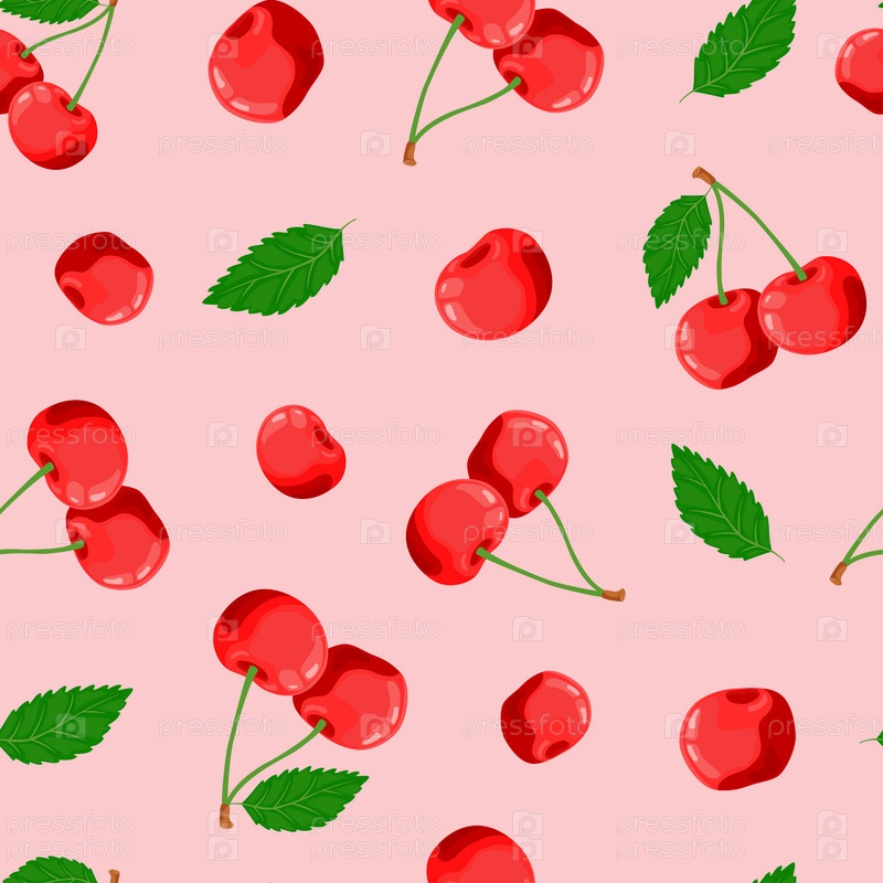 Бесшовный узор из вишни, зеленых листьев. Спелые ягоды. Сбор фруктов. Векторная иллюстрация в плоском стиле для дизайна меню, рецептов