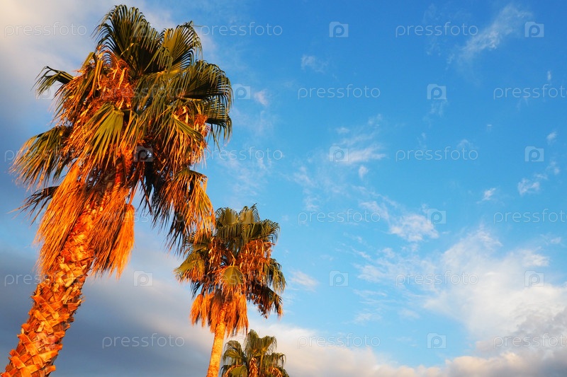 Пальмы на ветру на фоне голубого неба и облаков летним вечером. Закат. Герцег-Нови, Черногория. Тропический курортный пейзаж. Пляжный отдых. Мягкий, легкий ветерок качает пальмовые листья