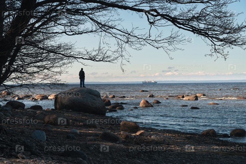 Человек стоит на камне на пляже и смотрит вдаль в море на корабль