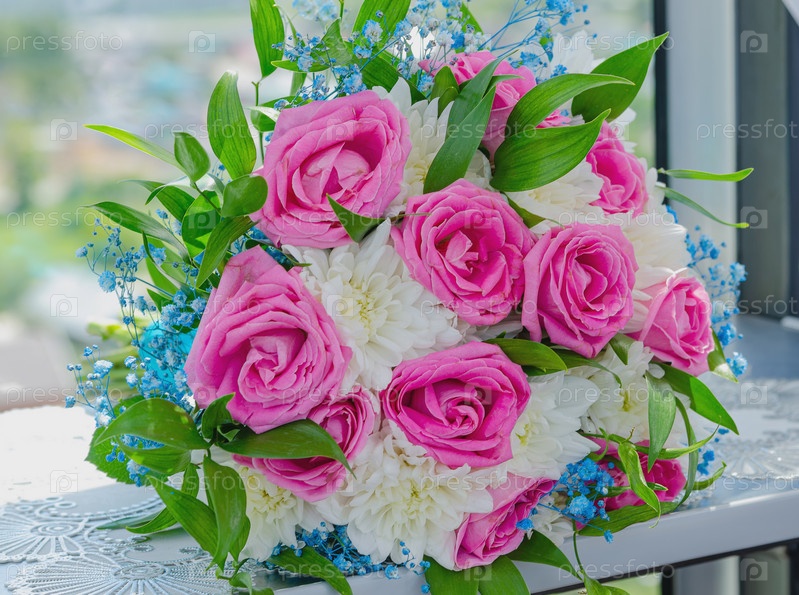 Праздничный свадебный букет невесты из разных цветов лежит на подоконнике