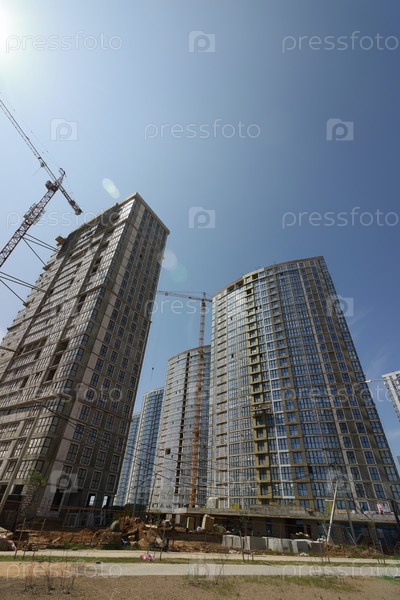 Строительная площадка. Железобетонные каркасы многоэтажных домов и строительных кранов. На фоне голубого неба