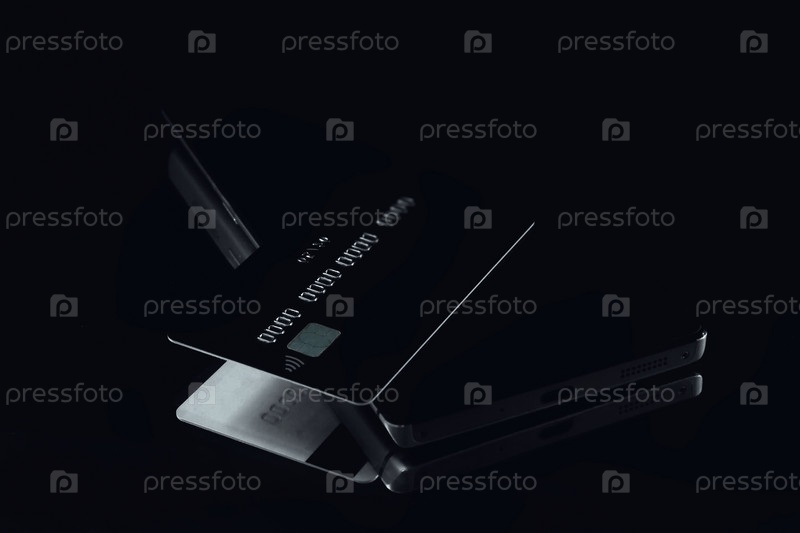 Кредитная карта на мобильном телефоне крупным планом на монохроматическом фоне, снятая с небольшой глубиной резкости